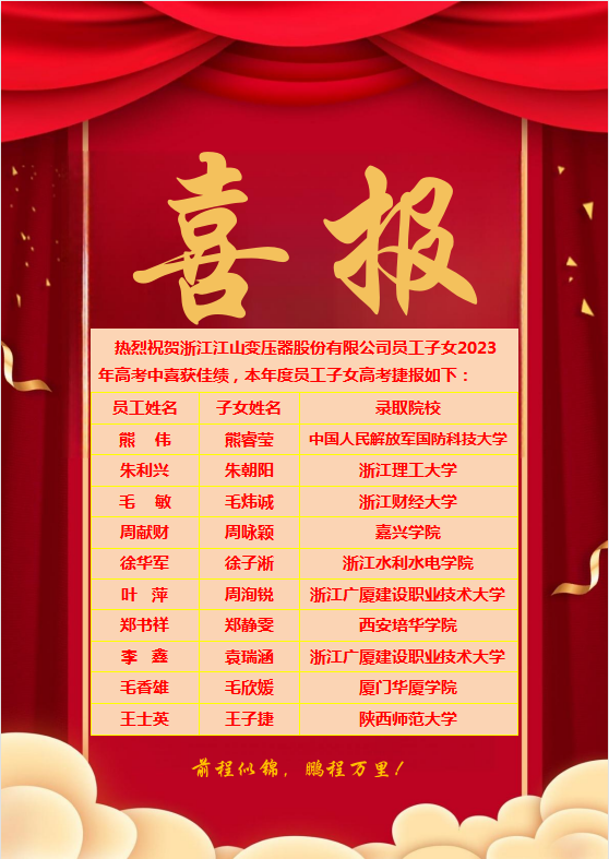 2023年8月16日下午,浙江江山变压器股份有限公司隆重举行了员工子女2023年高考表彰大会,对2023年参加高考并顺利被大学录取的10名员工子女进行表彰,公司主要领导及员工、员工子女一同出席会议。